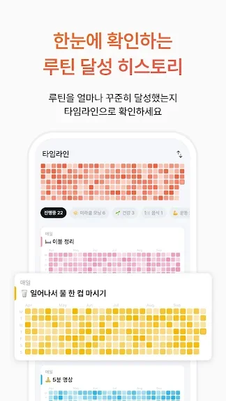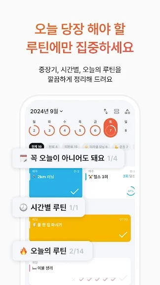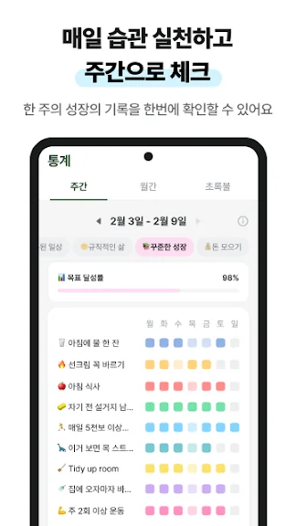 앱의 큰 장점은 루틴별 목표치 설정이 가능하고, 달성률을 실시간으로 기록해 주는 점입니다. 주간, 월간, 일간 달성 현황을 한눈에 볼 수 있어 진행 상황을 쉽게 파악할 수 있습니다. 또한, 위젯 기능을 통해 홈 화면이나 잠금 화면에서 바로 루틴을 확인할 수 있어 편리합니다.
