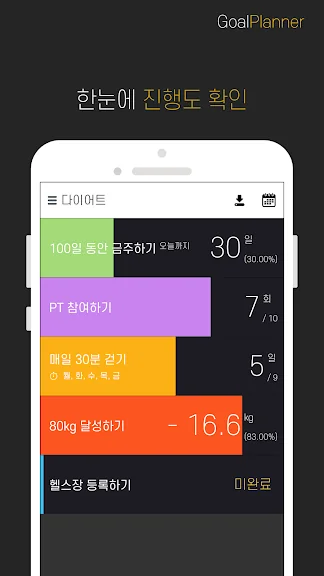 아래는 목표 달성 - 골 플래너 (습관 만들기 / 할일 관리) 어플에 대한 스크린샷 정보입니다.