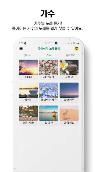 좋아하는 가수의 복음성가 노래를 쉽게 찾을 수 있습니다.