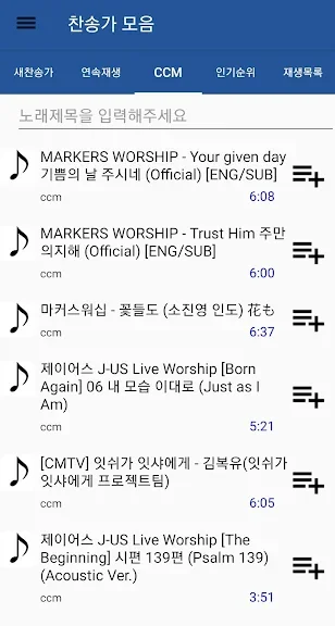 CCM 또한 100곡 정도 되는 곡들을 검색하여서 들을 수 있습니다
