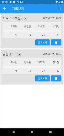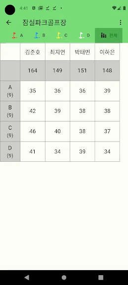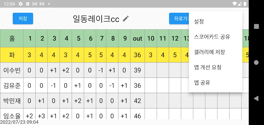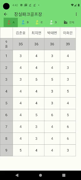 파크골프 스코어카드 어플에 대한 스크린샷 정보가 필요하시다면 아래 이미지를 참고하시기 바랍니다.