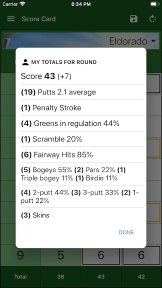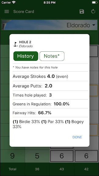 - 코스 및 홀별 평균 및 점수 기록에 대한 액세스를 탭하세요.