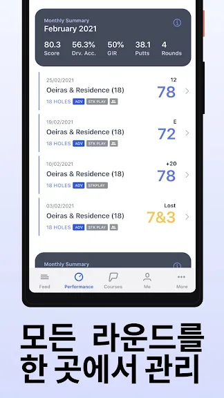 스코어 관리를 위한 평균스코어 및 퍼트수, GIR, Fairway Hit 등의 통계 자료를 한눈에 알아볼 수 있도록 간편하게 정리해 드리며, 개인 스코어 뿐만 아니라 동반자 기록도 함께 기록하고 저장하여 공유할 수 있습니다.