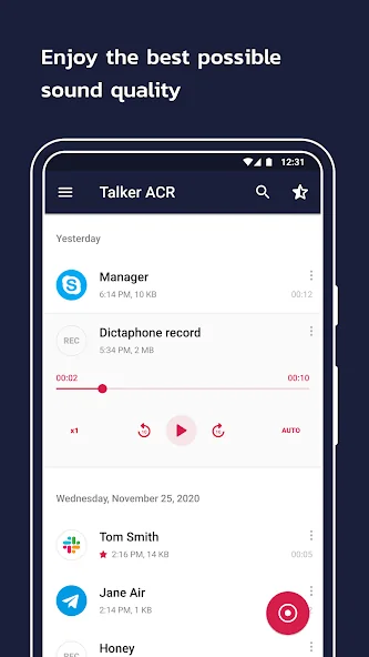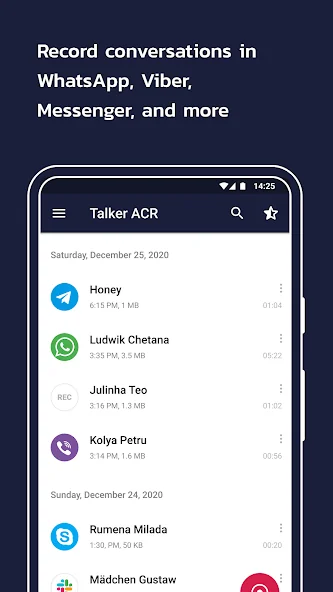 유사한 종류의 다른 앱과 달리 Talker 통화 녹음기 ACR을 사용하면 몇 가지 간단한 단계만으로 WhatsApp 통화와 Viber, Skype, Hangouts, Facebook 및 기타 메신저의 대화를 가능한 최고 품질로 녹음할 수 있습니다.