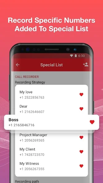 - 선택한 번호의 통화 내용을 자동으로 녹음. 항상 녹음하길 원하는 사람들의 목록을 생성하세요.