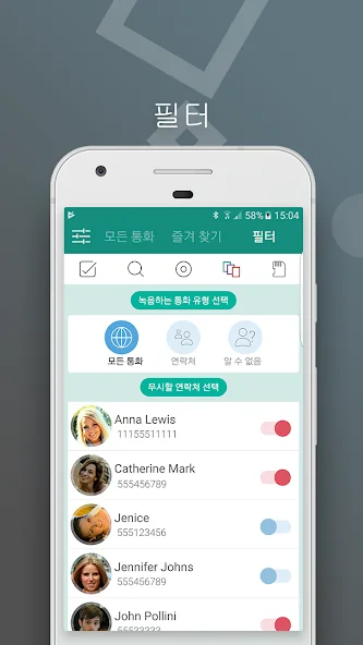 - 선택한 번호의 통화 내용을 자동으로 녹음. 항상 녹음하길 원하는 사람들의 목록을 생성하세요.
