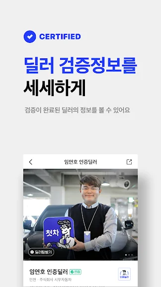 - 국내 유일! 첫차가 직접 심사하고 검증한 8,000명의 인증딜러가 활동해요.