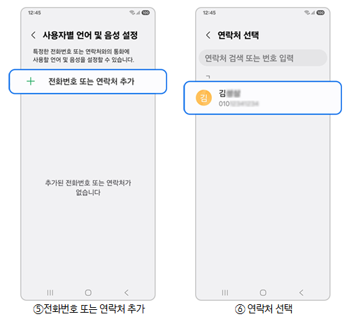 3단계) 전화번호 또는 연락처 추가를 눌러 설정을 원하는 연락처를 선택 후 언어 선택 후 확인하세요.