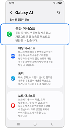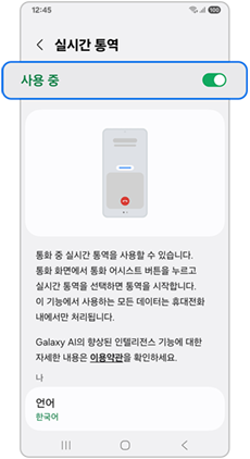 휴대전화 설정에서 AI 실시간 통역 기능을 활성화하면 통화 중에 해당 기능을 사용할 수 있습니다.