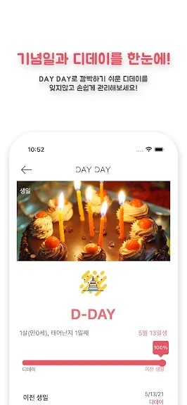 - 생일, 커플, 주/월/년 반복, 아기 개월 수, 음력 생일까지 편리하게 기념일을 기록해 보세요.
